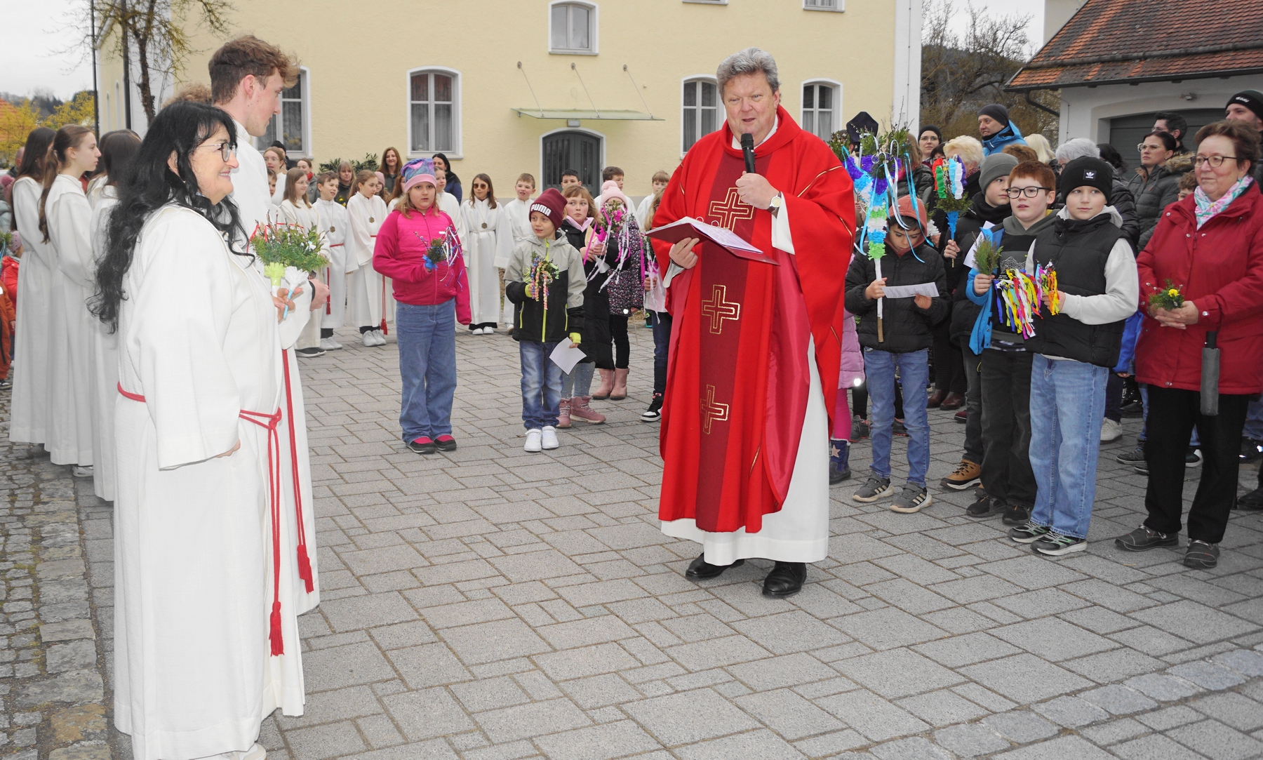 In seiner ergreifenden Ansprache unterstrich Pfarrer Kilian Limbrunner die maßgebliche Bedeutung der vergangenen fünf Wochen, welche der Vorbereitung auf Buße und Umkehr dienten. Er äußerte, dass die bevorstehende Zeitspanne uns nunmehr dem letzten Abendmahl, der Kreuzigung und schließlich der Auferstehung Jesu Christi entgegenführe. Die Feierlichkeit erfuhr eine Bereicherung durch die farbenprächtig verzierten Palmbuschen, welche von Erwachsenen wie auch von Kindern beigebracht wurden. Die mit farbenprächtigen Bändern und Schleifen versehenen Sträuße stellen Sinnbilder des Friedens, des Lobes und der Hoffnung dar. Pfarrer Limbrunner segnete die Palmbuschen, um ihrer tiefen spirituellen Bedeutung gerecht zu werden.