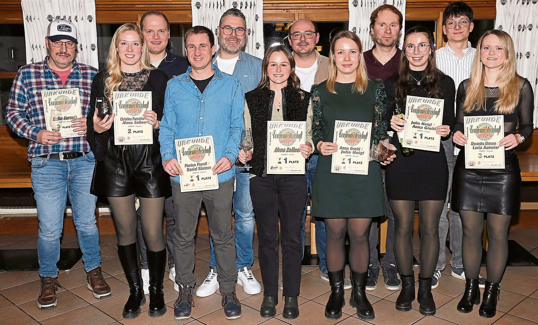 Zum Jahreswechsel 2025/26 wurden wieder die Vereinsmeisterschaften im Einzel, Mixed und Doppel der TT-Abteilung des FC Chamerau abgehalten. Die Siegerehrung wurde bei der alljährlichen Jahresabschlussfeier im Januar beim Gasthof Bäckerwirt abgehalten, wo die drei Erstplatzierten jeweils mit tollen Sachpreisen geehrt wurden.